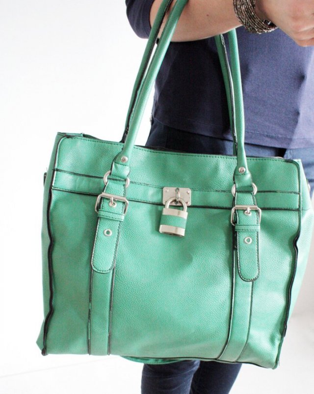 Duża, pojemna, bardzo wygodna torba marki New Look w ciekawym kolorze. Wykonana z ekoskóry. Wewnątrz podszewka. Zapięcie na zatrzask. Dwa krótsze uchwyty i jeden odpinany dłuższy. Torba nie pochodzi z second handu. Ma drobne ślady użytkowania widoczne na zdjęciach (gł. na czarnych elementach i w okolicach kłódki).