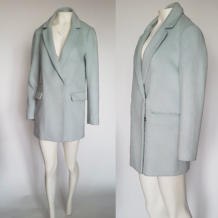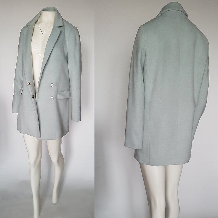 Elegancki płaszcz o prostym kroju (loose fit), sięgający do połowy ud, z kołnierzem wykładanym/ rewersowym. Zapinany na kryte zatrzaski, z przodu kieszenie wpuszczane z klapami. Wykonany z przyjemnego materiału z włosem, z domieszką wełny. Kolor jasny seledynowy (tonacja idąca bardziej w zieleń niż niebieski). Płaszcz na podszewce, idealny na sezon przejściowy.