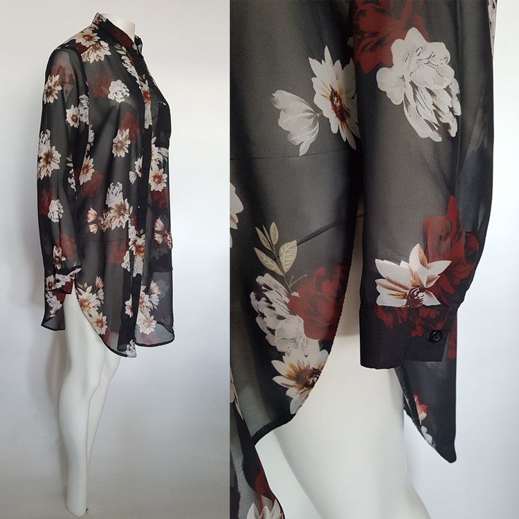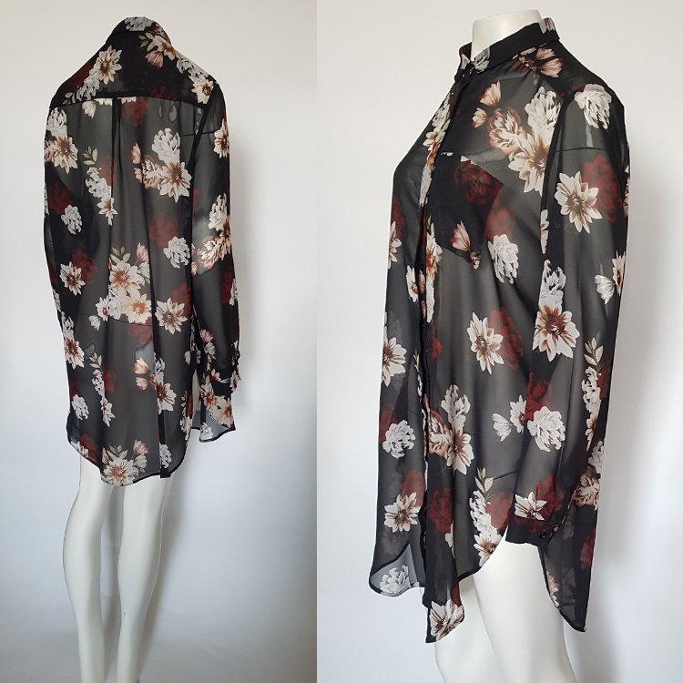 Dłuższa koszula/ tunika z czarnego szyfonu, we wzory kwiatowe. Koszula zapinana z przodu na guziki z masy perłowej,kryte listewką, wykończona kołnierzem, dół zaokrąglony., po bokach rozcięcia. Rękawy długie zakończone mankietem.