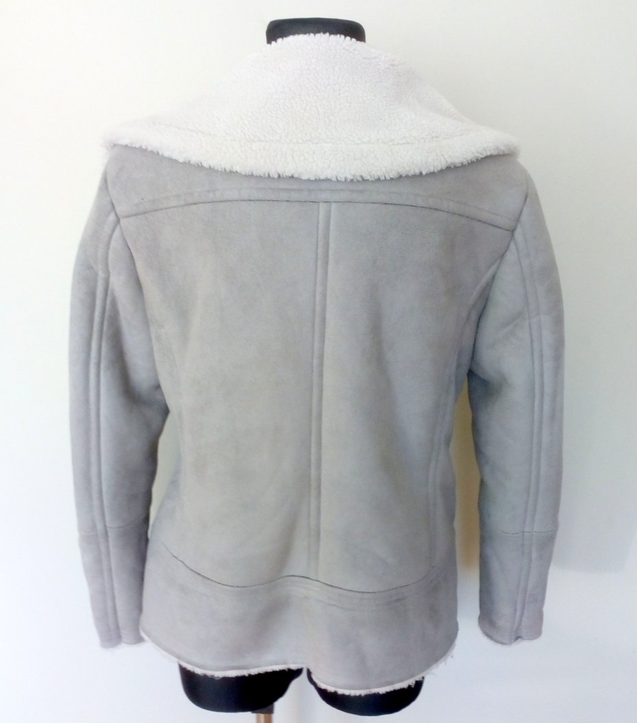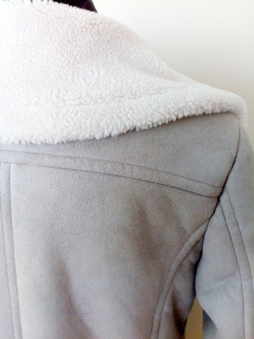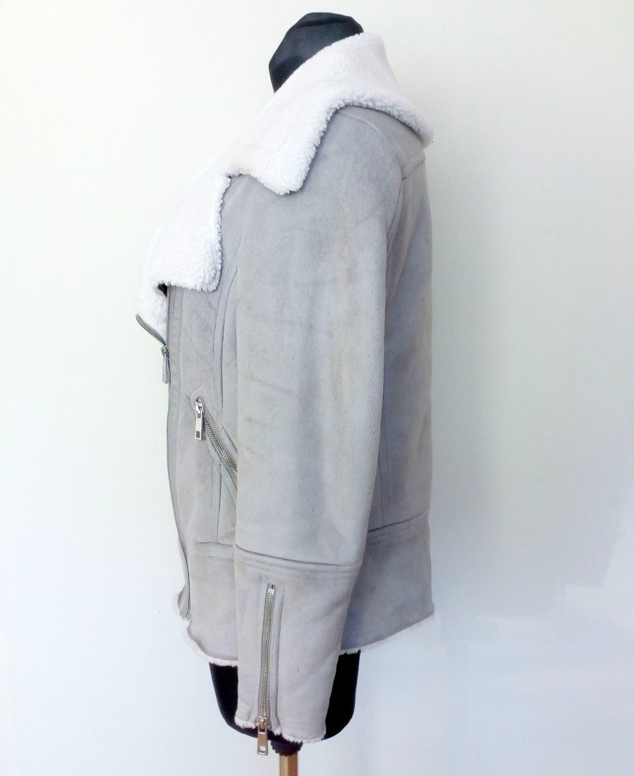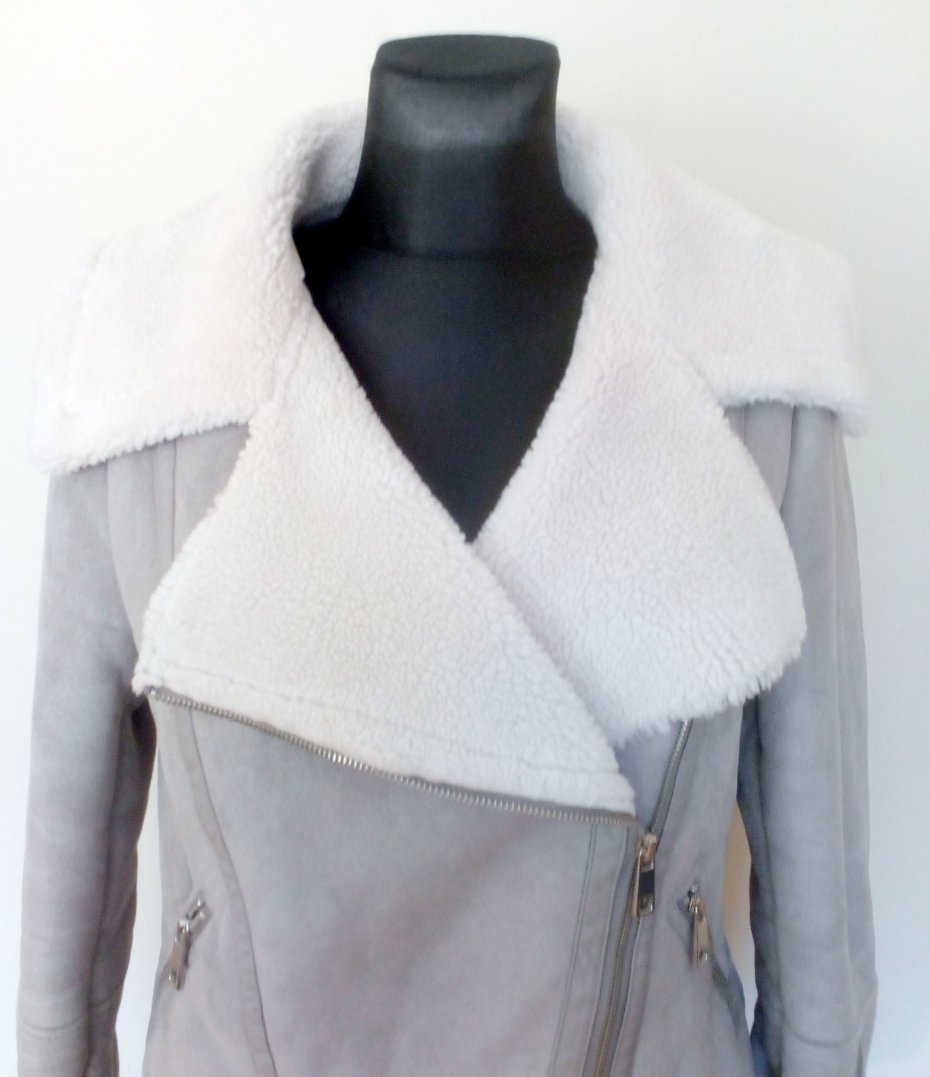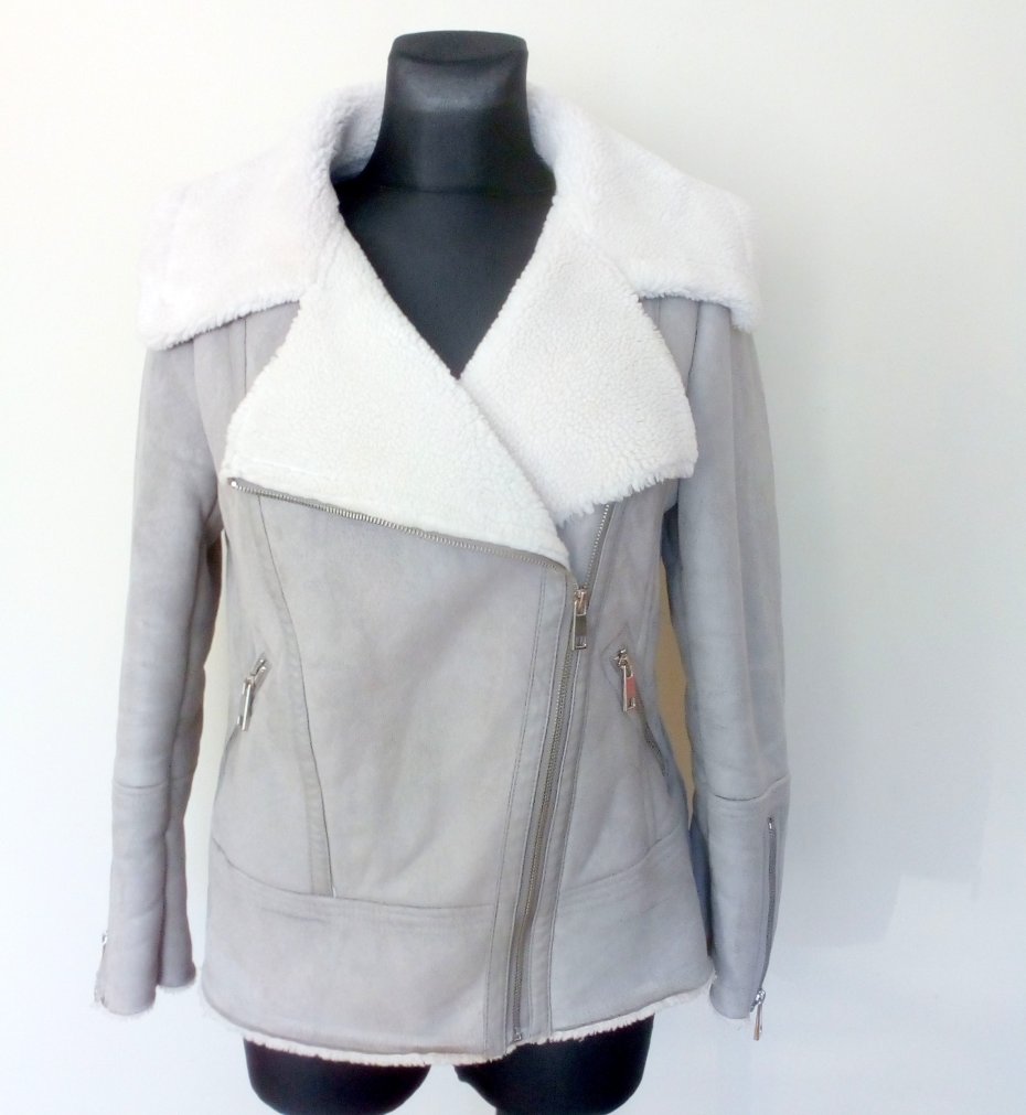 Szara kurtka z tkaniny imitującej zamsz, zapinana po boku na metalowy zamek, zamki również u dołu rękawów i w kieszeniach z przodu, kurtka od środka w całości na białym krótko strzyżonym futerku