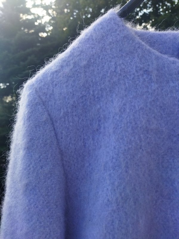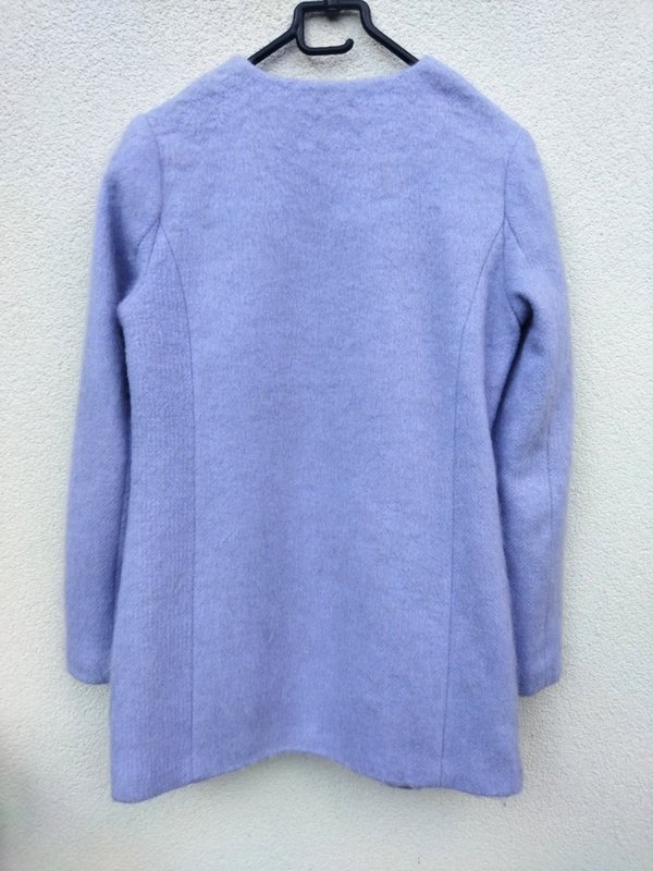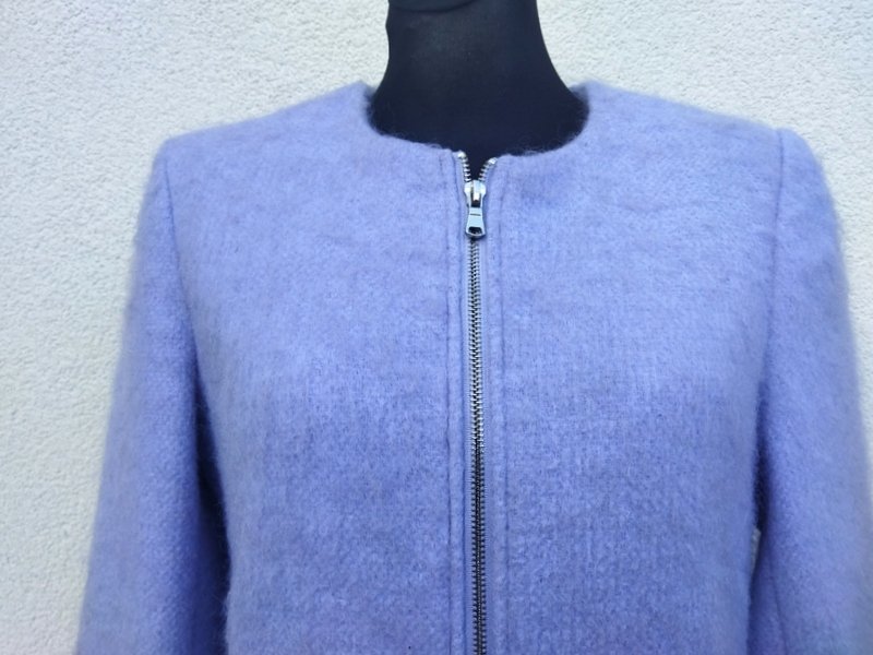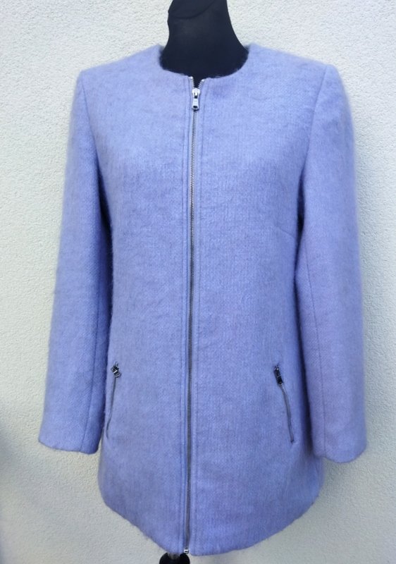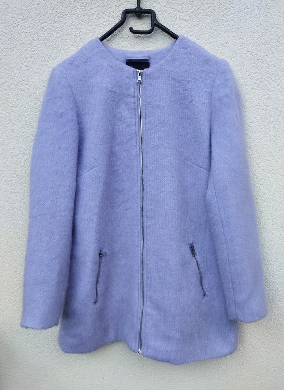 Płaszcz z wełniano-poliestrowej tkaniny z moherową fakturą w liliowym kolorze . Minimalistyczny krój, z dwiema wpuszczanymi kieszeniami z zamkami, Zapinany z przodu na zamek. Całość na podszewce. Miły i bardzo lekki.