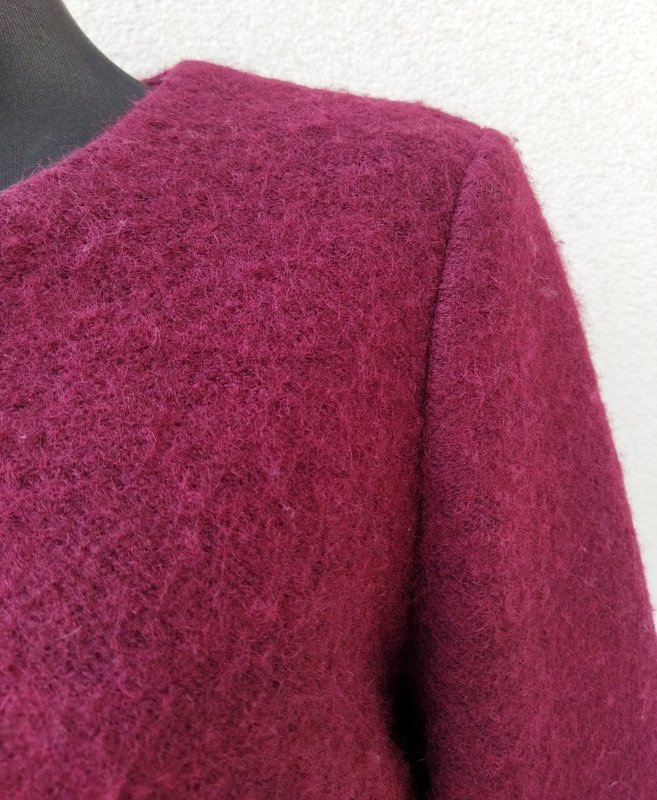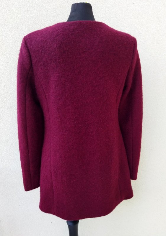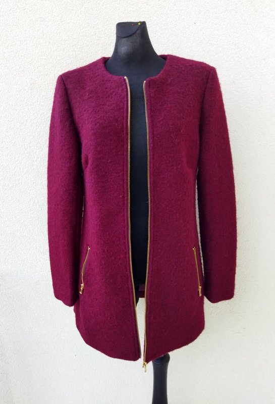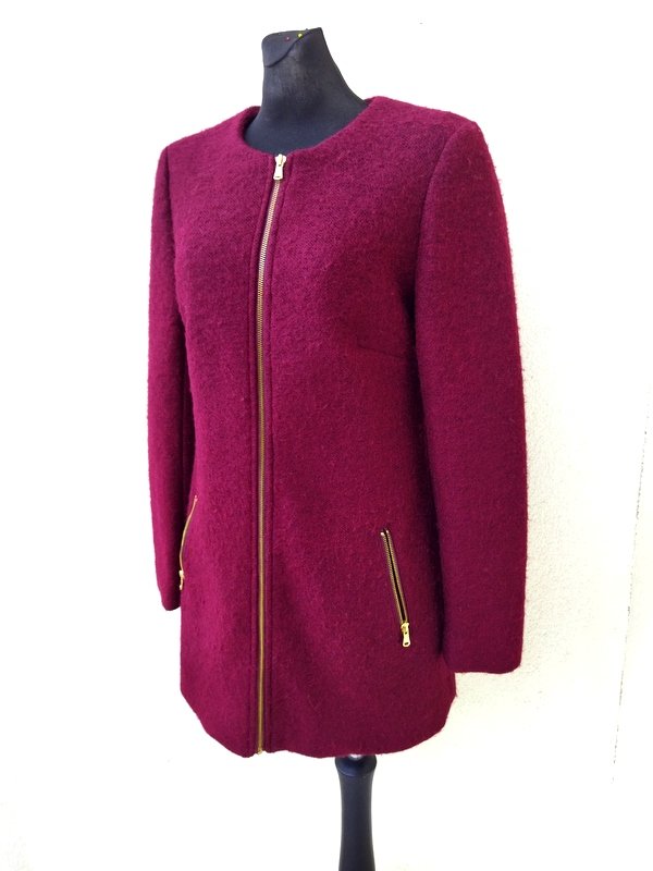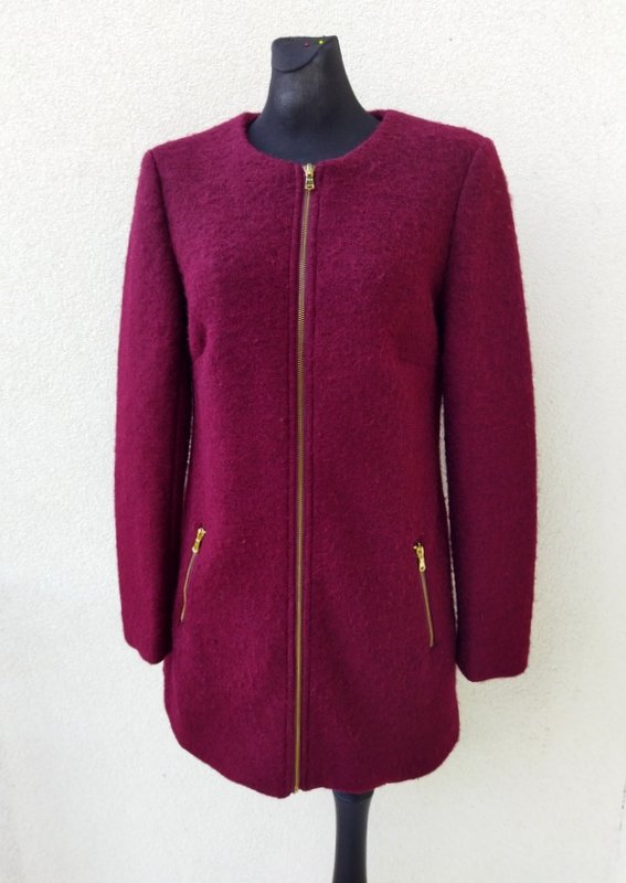 Zgrabny płaszcz z przewaga wełny w składzie w burgundowo-wiśniowym kolorze. Minimalistyczny krój z dwiema wpuszczanymi kieszeniami z zamkami. zapinany z przodu na zamek. Całość na podszewce.