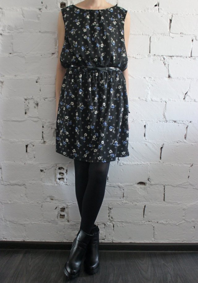 Sukienka w kwiatki. Firma New Look. Rozmiar z metki 46/XXXL. Wymiary: obwód biustu-59cmx2 (mierzony od pachy do pachy), obwód pasa-59cmx2 (regulowany gumką), obwód bioder-68cmx2, długość sukienki-97cm. Skład materiału: 100% poliester.