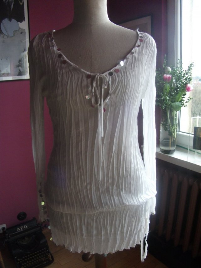 NOWA ,BEZ METKI 100% POLYESTER,NIE WYMAGA PRASOWANIA :)DŁUGOŚĆ 78,RĘKAW 60CM,WYKOŃCZONA SREBRNYMI CEKINAMI,DELIKATNA,KOBIECA