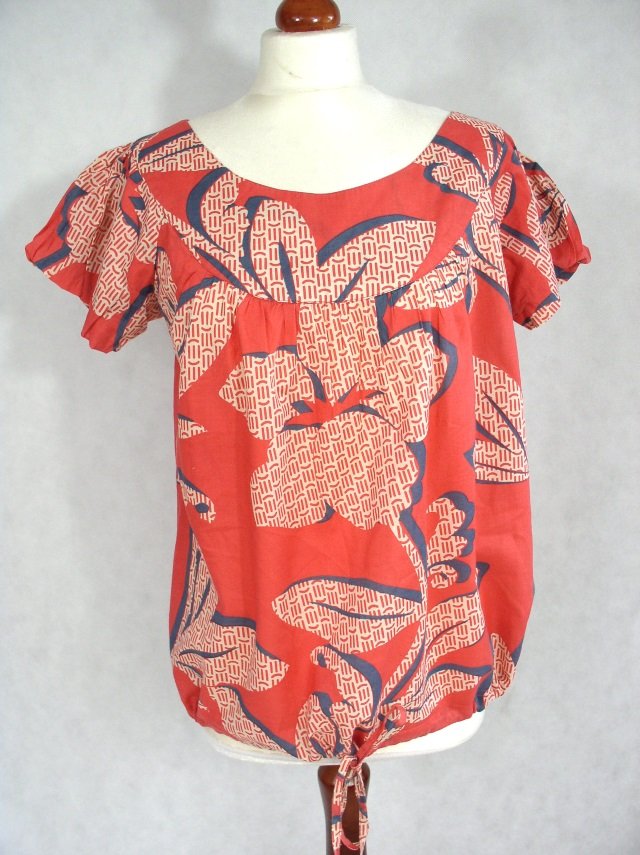 Bluzka firmy next.Rozmiar 14,nasz 40-42.Materiał bawełna.W górze okrągły karczek.Rękaw reglan z podwójnie złożonego materiału,marszczony na ramieniu.W dole tunel z wciągniętym paskiem do regulowania i wiązania.Stan bardzo dobry.Długość 64 cm.pod pachami 108 cm.