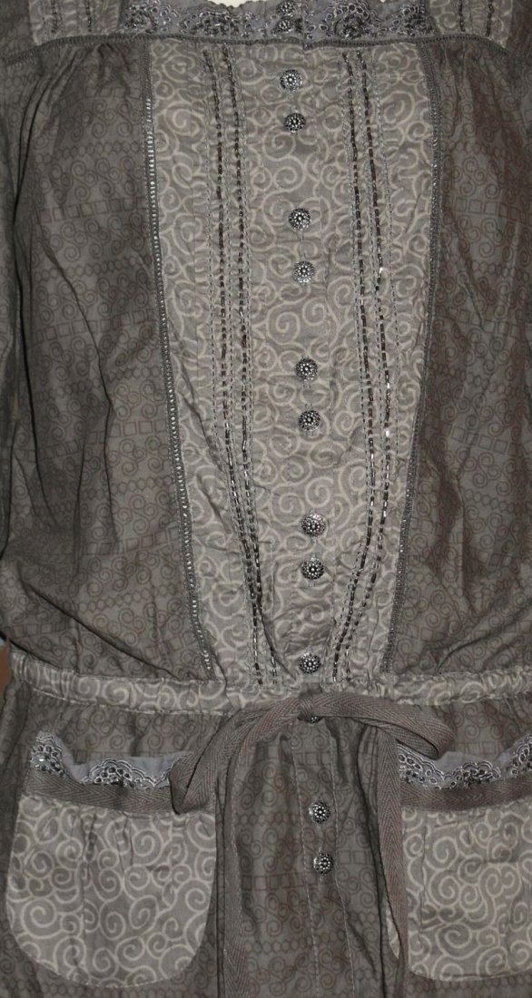 Subtelny kolor taupe ozdobiony koralikami i guziczkami w kolorze srebrnym.