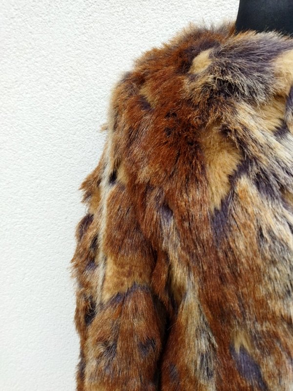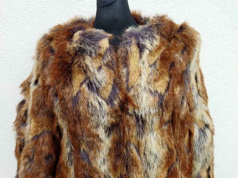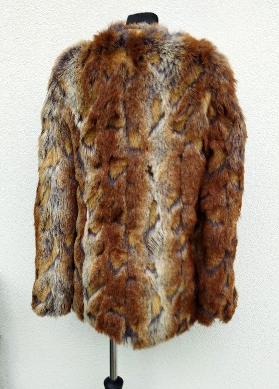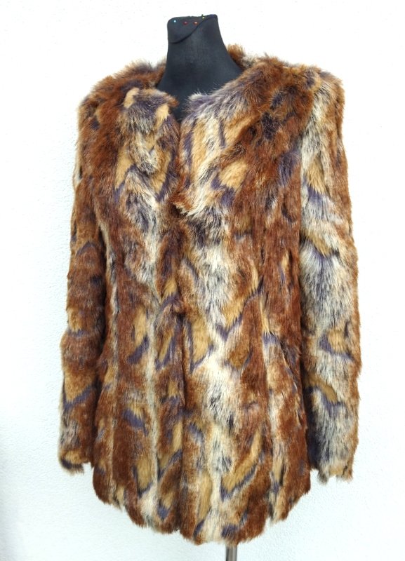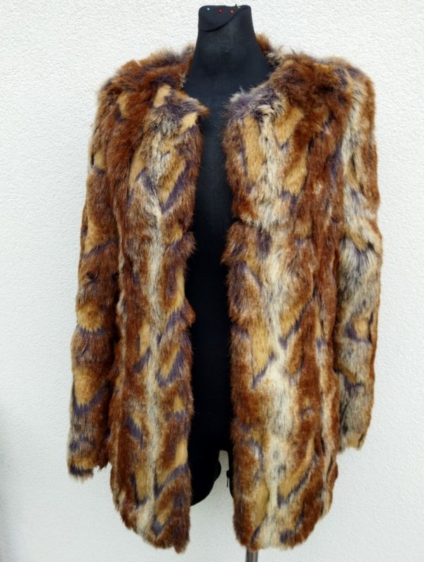 Kurtka ze sztucznego futerka z dłuzszym i krótszym włosem w kolorystyce odcieni brązu, beżu i szarości . Bez kołnierza, z dwiema wpuszczanymi kieszeniami. Zapinana na haftki. Całość na podszewce .