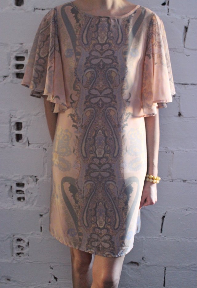 Sukienka z ozdobnymi rękawami. Firma Next. Rozmiar z metki 40/L. Wymiary: obwód biustu-48cmx2 (mierzony od pachy do pachy), obwód pasa-46cmx2, obwód bioder-53cmx2, długość sukienki-90cm. Skład materiału: 100% poliester. Sukienka posiada podszewkę.