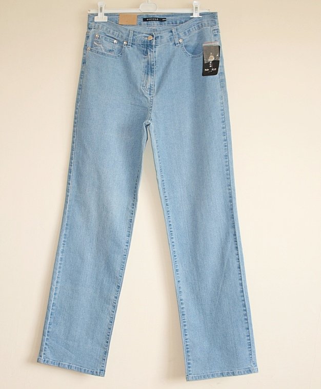 Spodnie nowe z metką. Prosta nogawka Bardzo ładne wykończenie kieszonek srebrną nitką i kryształkami. Logowane guziki i nity. Materiał 78% bawełna, 20% poliester, 2% spandex. Rozmiar z metki 44. Podaję wymiary mierzone na płasko;