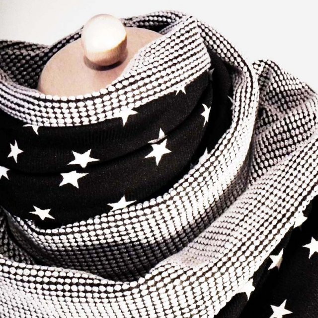 Dzianina i dżersej z motywem gwiazd świetnie się ze sobą komponują, tworząc wyjątkowy, bardzo modny szal-komin. Można nosić także jako kamizelkę - etolkę.