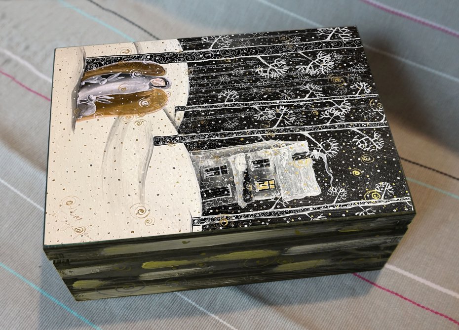 Drewniane pudełko na różności z reprodukcją obrazu autorskiego, noszącego tytuł "Nie musisz robić wielkich rzeczy - wystarczy, że robisz małe rzeczy z wielką miłością". Reprodukcja umieszczona jest metodą decoupage na wierzchniej części, boki szkatułki natomiast malowane są ręcznie, a całość zabezpieczona jest bezbarwnym lakierem oraz sygnowana w środku.