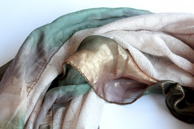 Niezwykły szal łączony z dwóch tkanin, ozdobiony ciekawymi detalami.