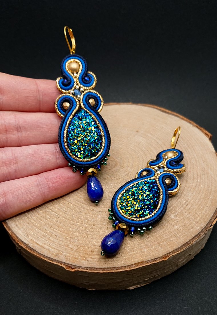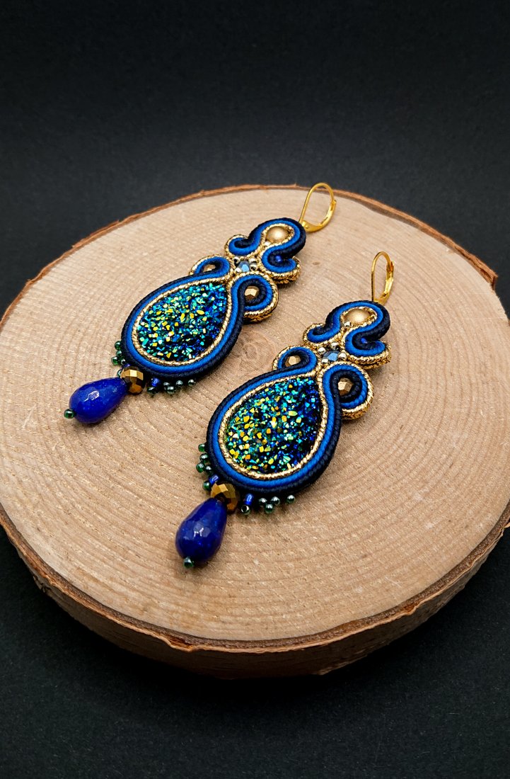 Duże, zjawiskowe kolczyki sutasz idealne sprawdzą się jako biżuteria wieczorowa lub na przyjęcie. Stonowany granat i kobalt przełamany błyszczącymi elementami dopasuje się do wielu stylizacji. Pomimo swoich rozmiarów kolczyki dość lekkie, bardzo wygodne w noszeniu.