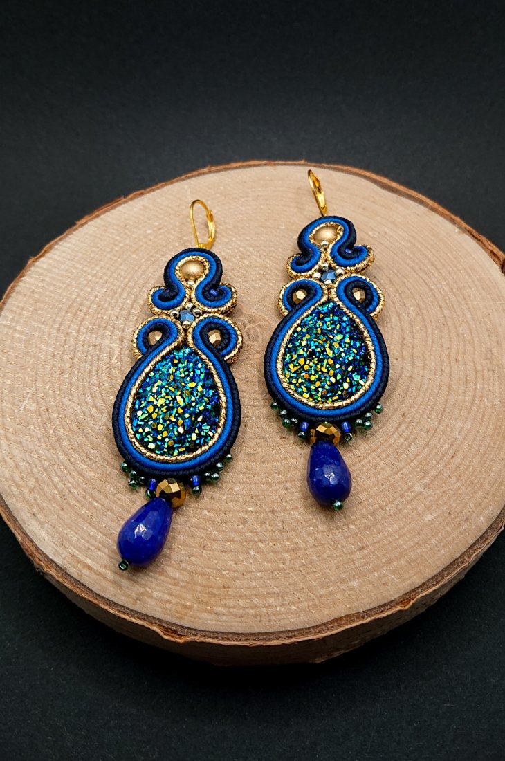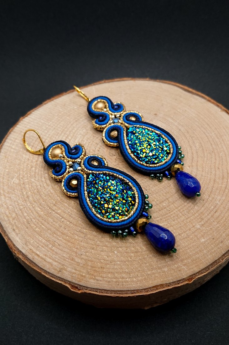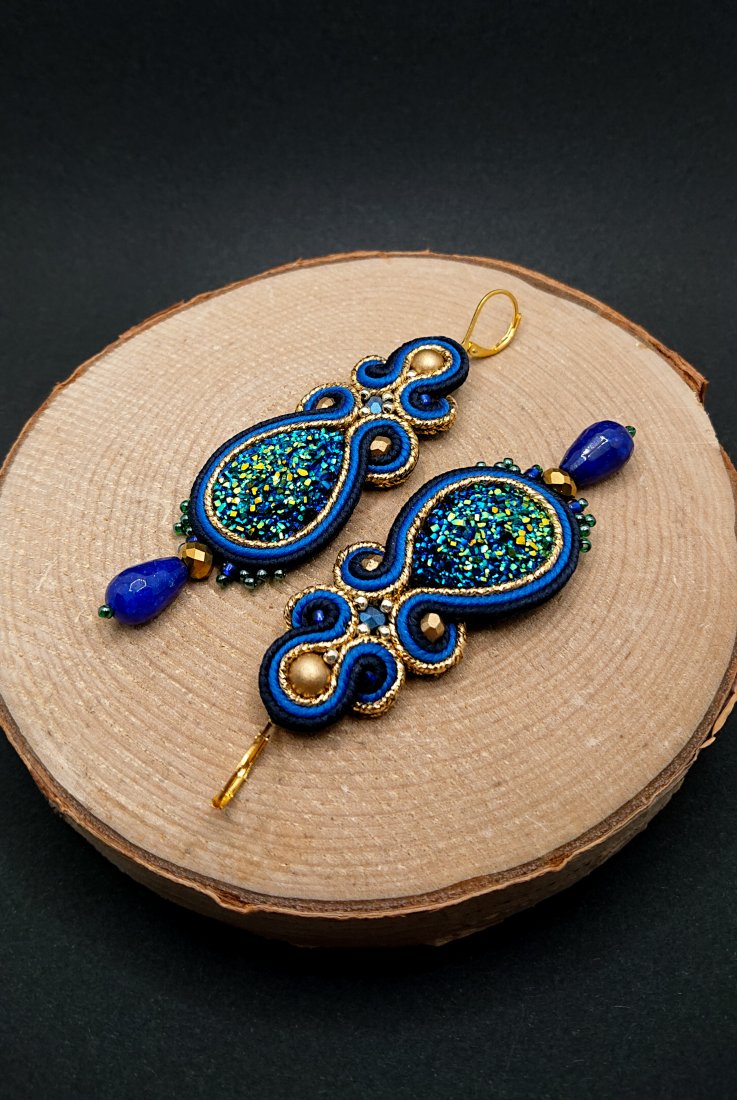 Błyszczące kaboszony z żywicy otoczone polskimi sznurkami sutasz w kolorze granatowym, kobaltowymi i metalizowanym złotym oraz czeskimi i japońskimi szklanymi koralikami. Dół kolczyków zdobią duże krople jadeitu. Kolczyki zawieszone na biglach angielskich w kolorze złotym.