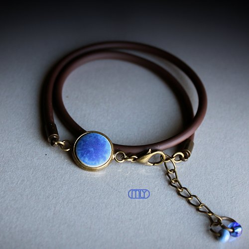 Efektowna bransoletka wykonana z linki kauczukowej w kolorze brązowym, elementów w kolorze starego złota i ręcznie wykonanej ceramicznej zawieszki, szkliwionej mieszanką błękitnych szkliw z efektem plamek, Obwód regulowany. Polecam