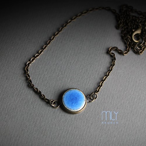 Okrągły ceramiczny wisior, ręcznie wykonany z mocno spieczonej gliny kamionkowej, szkliwiony efektowną mieszanką błyszczących błękitnych szkliw z efektem plamek, zawieszony na łańcuszku w kolorze starego złota. Średnica zawieszki ok. 1,2cm, długość łańcuszka 2x20cm. Polecam . Termin realizacji zamówienia to 1-2 dni