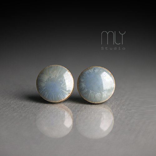 Ceramiczne lekko nieregularne kolczyki w formie sztyftów, ręcznie wykonane z delikatnej gliny kamionkowej, jednostronnie szkliwione beżowo błękitnym szkliwem z efektem drobnych plamek, na antyalergicznych sztyftach w kolorze srebrnym.Średnica ok. 9mm. Polecam