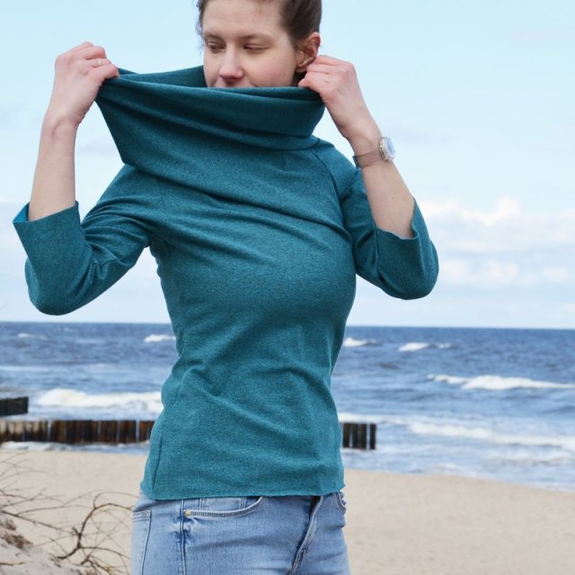 Bluza z szerokim asymetrycznym golfem wykonana została z dzianiny dresowej w kolorze niebieskim. Prosty, dopasowany krój, bardzo wygodna, surowo wykończona. Możliwość zamówienia rozmiarów S,M,L. Czas oczekiwania na wykonanie zamówienia do 7 dni.