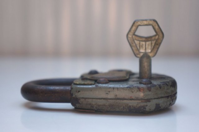 Stara, zardzewiała kłódka z kluczykiem. Kłódka sprawna, z pozostałością niebieskiej farby. Przedmiot nie jest nowy, jest to stary, oryginalny przedmiot. Specjalnie nie został oczyszczony. Pochodzi z lat 60. XX w.