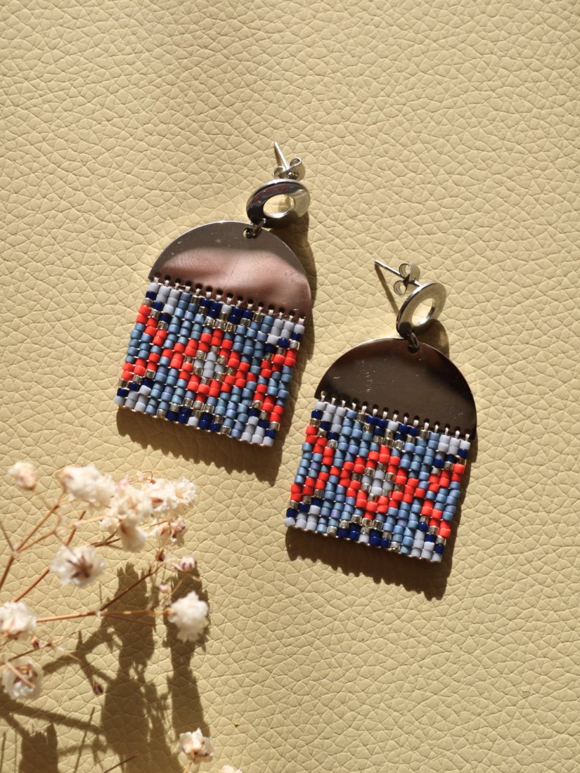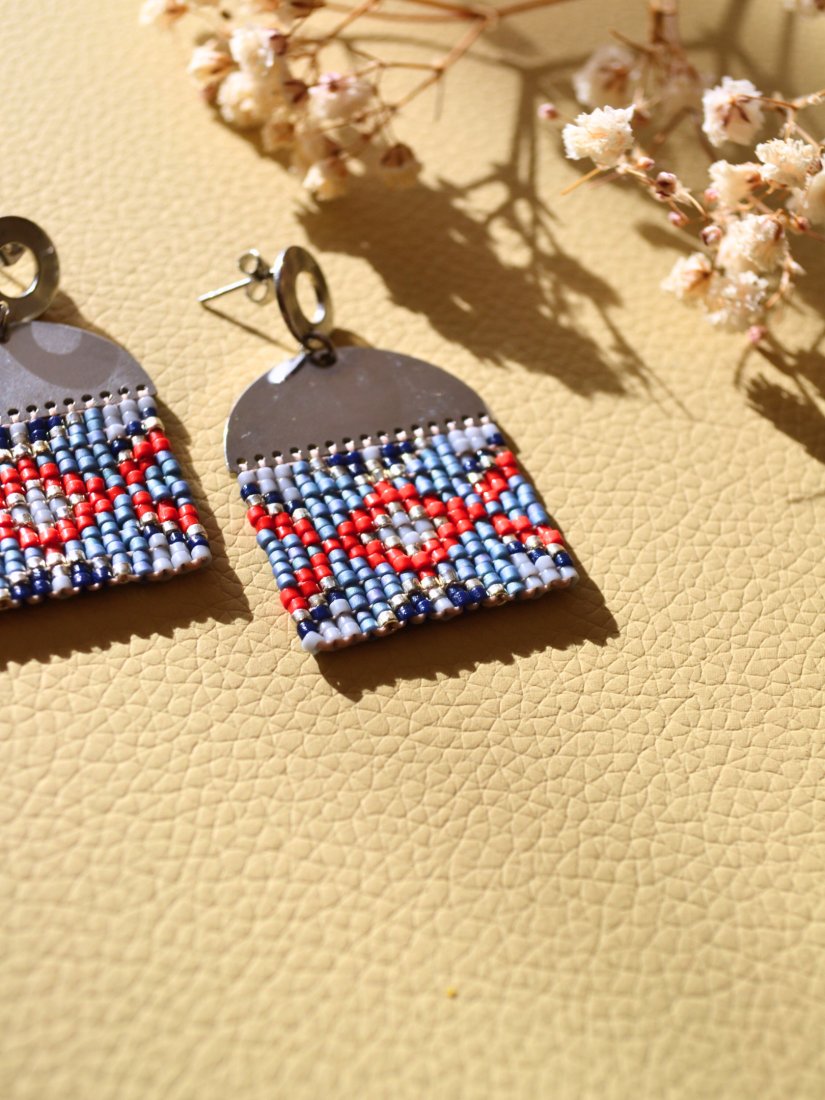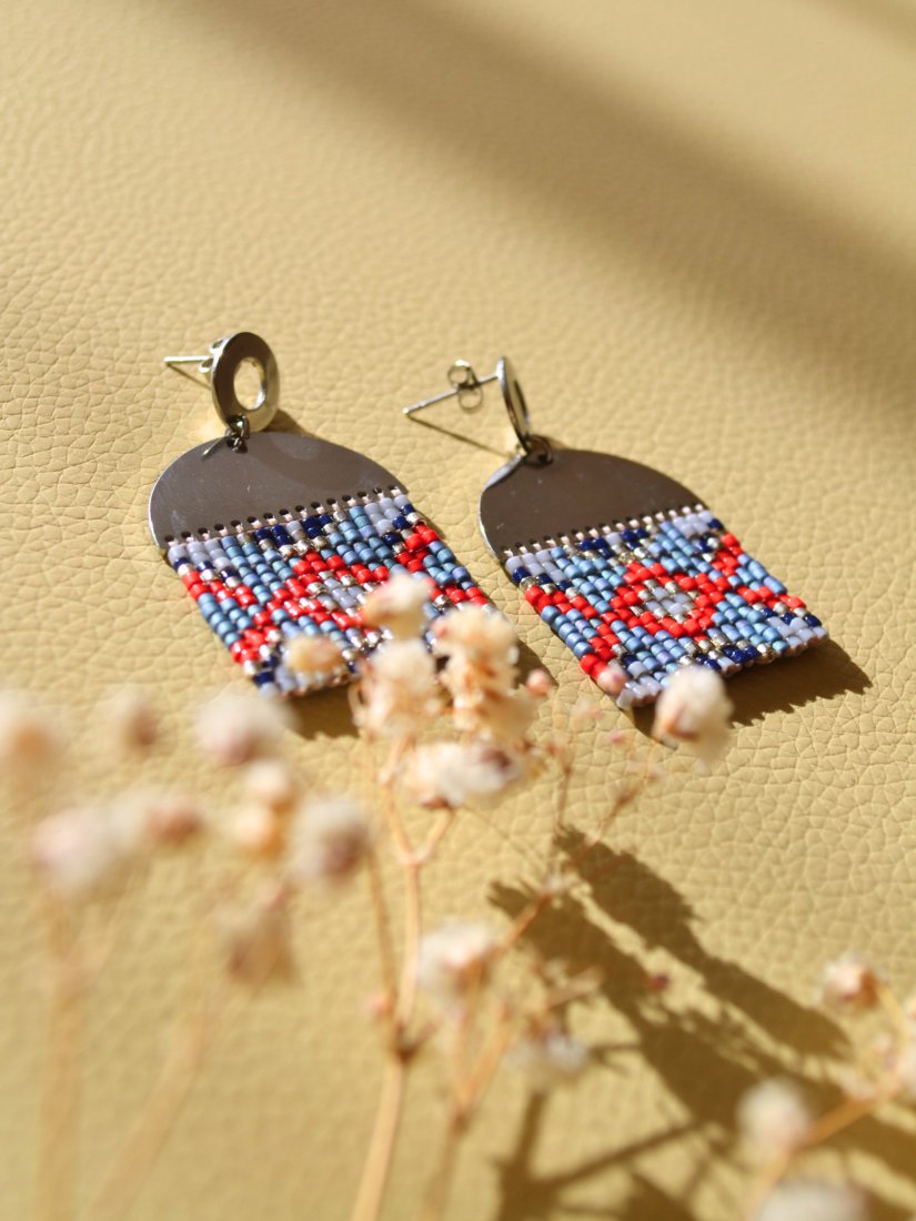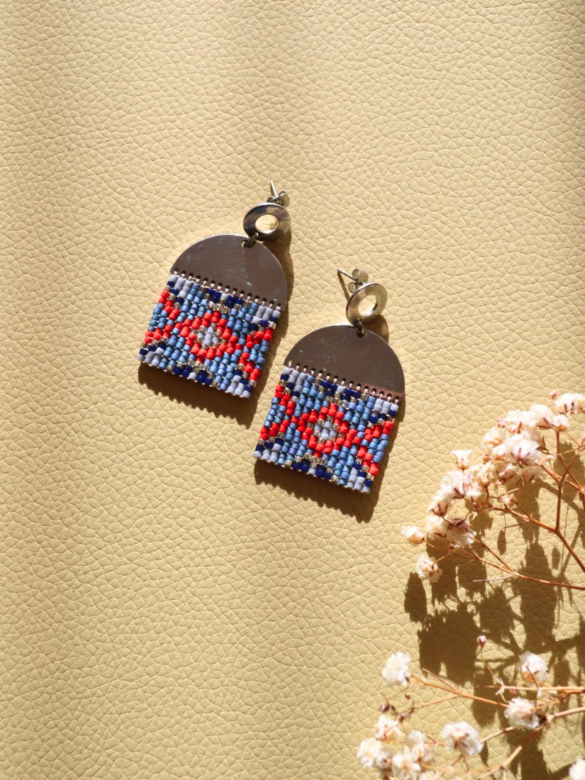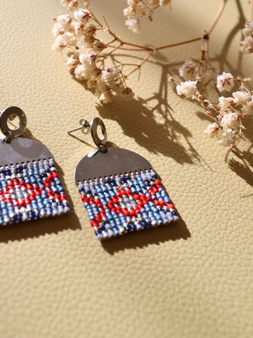 Niebiesko-czerwone kolczyki utkane z koralików, połączone z metalowymi elementami w kolorze srebrnym.