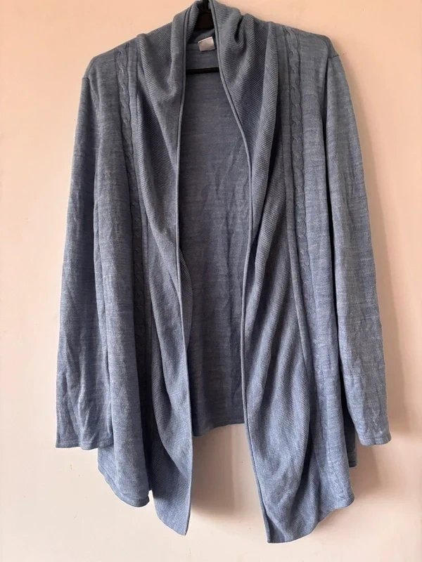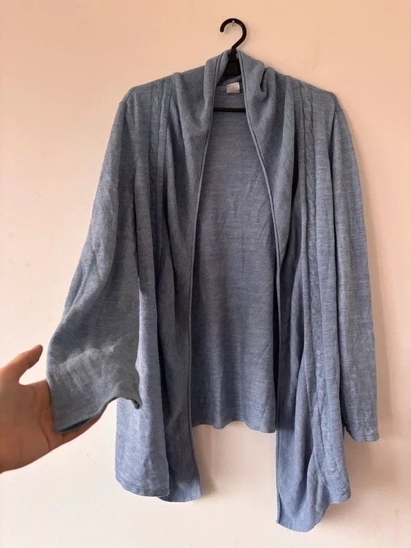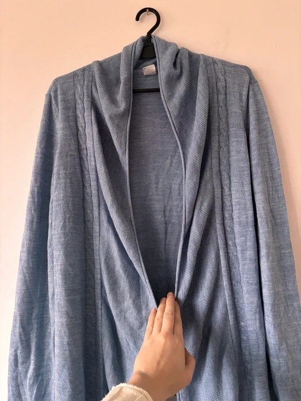 Miękki i lekki kardigan w odcieniu jasnego błękitu. Model open front bez zapięcia, z pięknie układającym się, lejącym kołnierzem. Po bokach delikatny ozdobny splot.