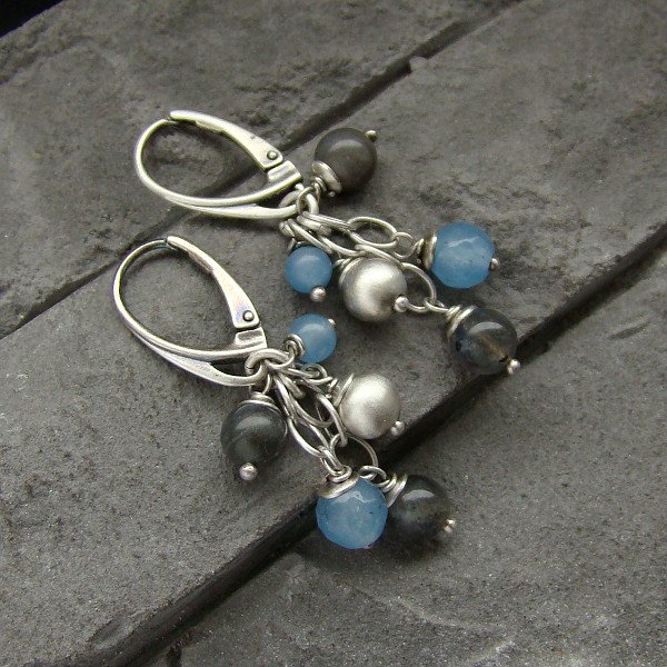 Kobiece, skromne kolczyki z pięknymi kamieniami. Wykonane w całości z oksydowanego srebra próby 925 oraz fasetowanych kulek niebieskiego jadeitu i gladkich kulek labradorytu wielkosci 6 mm oraz 4 mm kulek jadeitu. Całkowita długość kolczyków to 4,6 cm. W mojej galerii bransoletka do kompletu. Ozdobnie zapakowane.