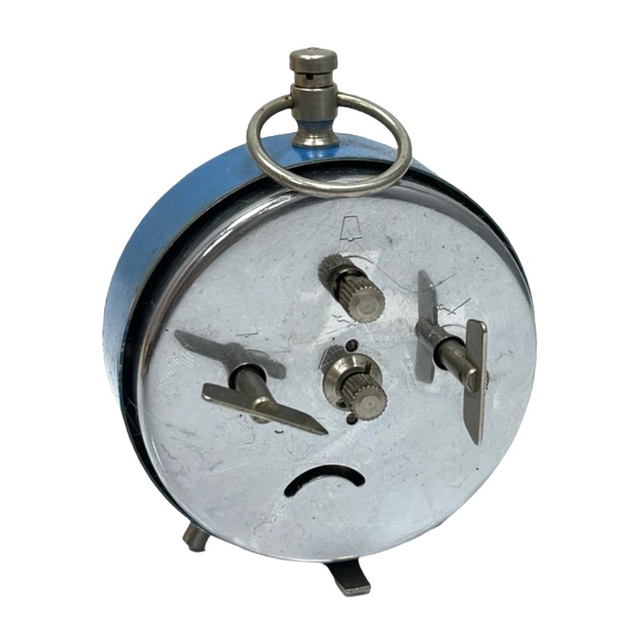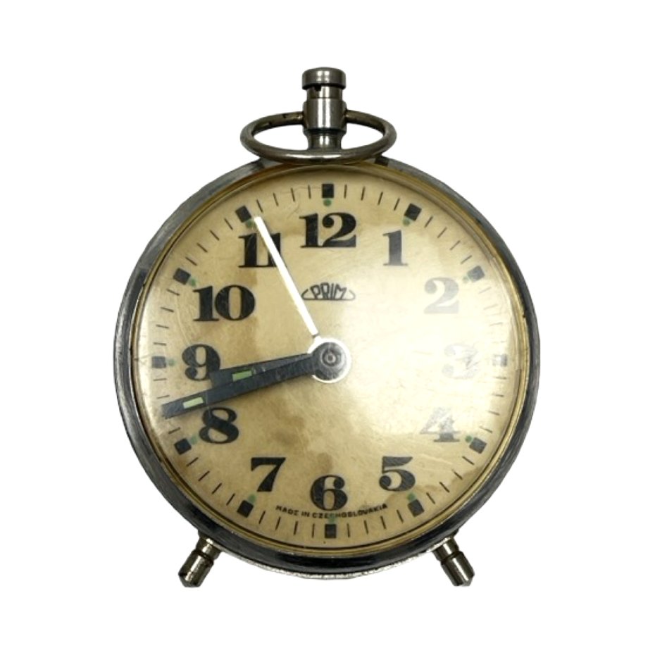 klasyczny, mechaniczny budzik marki PRIM w rzadziej spotykanej, niebieskiej obudowie. Model ten posiada charakterystyczny górny uchwyt (ucho) oraz klasyczny design typowy dla produkcji czechosłowackiej z lat 60/70.
