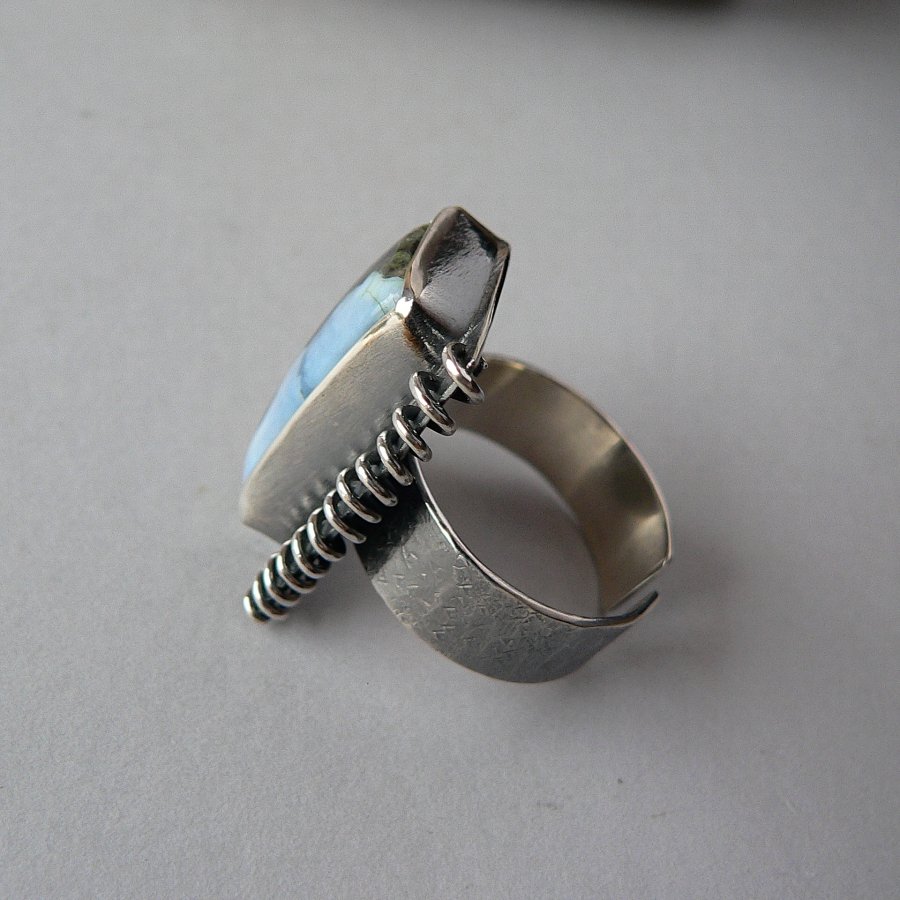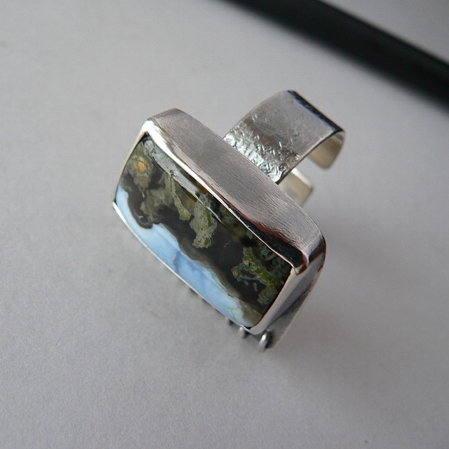 Pierścień wykonany z niebieskiego opala i srebra. Srebro kute, o surowym charakterze wykończone błyszczącym obszyciem. Całość oksydowana, detale polerowane. Wymiary frontu pierścienia 3/2 cm, opal - 2,4/1,5 cm Rozmiar regulowany, przy zakupie proszę o podanie noszonego rozmiaru, ustawię obrączkę.