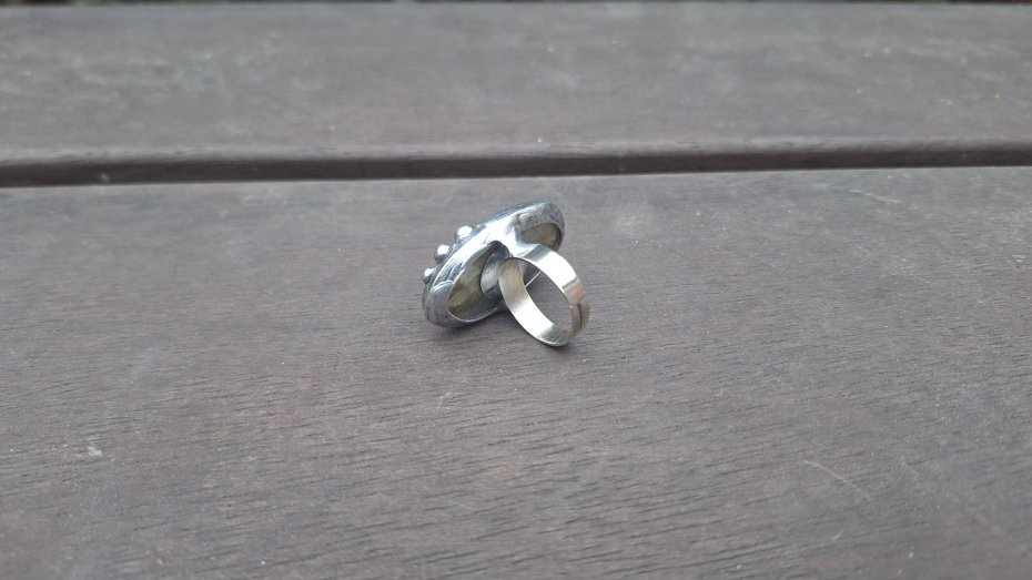 Pierścionek wykonany z miedzi, cyny i labradorytu. Wymiary ok. 3 na 1.7 cm. Regulowany. Nie jest ciężki.