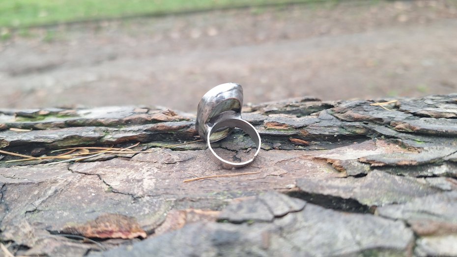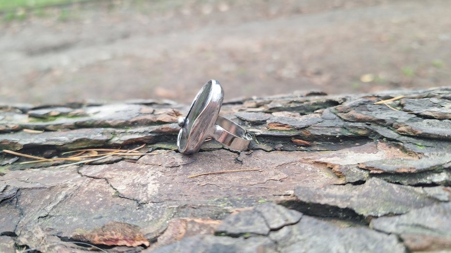 Pierścionek wykonany z miedzi, cyny i labradorytu. Wymiary ok. 2.5 na 1.5 cm. Regulowany. Nie jest ciężki.
