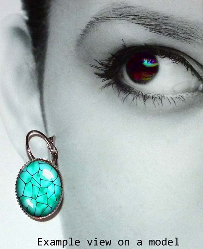 Kolczyki z unikatową grafiką, zatopioną pod wypukłym szkiełkiem, w posrebrzanej oprawie. Grafika jest najwyższej jakości, wyraźna i nasycona. Bigle posrebrzane, zapinane, sztywno przymocowane do oczka, hipoalergiczne- nie zawierają niklu i ołowiu. Kaboszony szklane z grafiką są unikatowe, wykonane ręcznie według mojego projektu z najwyższą starannością, dlatego biżuteria ta jest jedyna w swoim rodzaju i niespotykana.