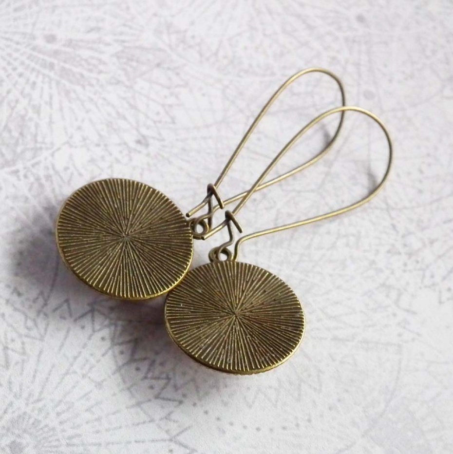 Kolczyki z oryginalną grafiką, zatopioną pod wypukłym szkiełkiem ( tzw. szklanym kaboszonem dającym delikatny efekt trójwymiarowości) i oprawioną w hipoalergiczną bazę w kolorze antycznego złotego brązu. Grafika jest najwyższej jakości, bardzo wyraźna i nasycona. Duże bigle antyalergiczne w kolorze antycznego złotego brązu z wklejonymi koralikami i rurkami ze szkła - rurki połyskujące w kolorze antycznego złota, koraliki w kolorze turkusowym.