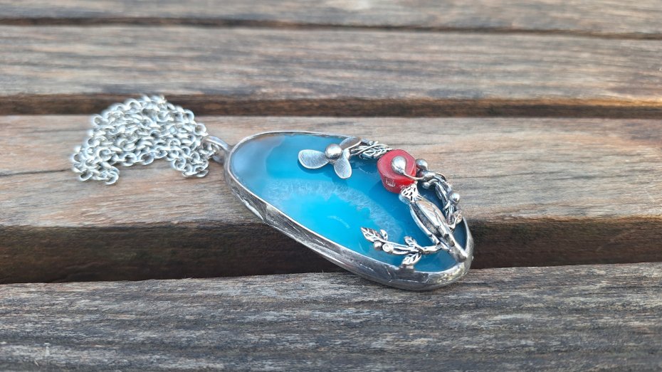 Wisiorek wykonany z miedzi, cyny, koralowca i agatu. Wymiary ok. 6 na 3.5 cm. Zawieszony na łańcuszku o długości ok. 50 cm.