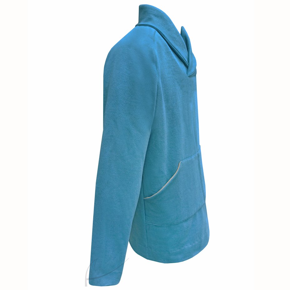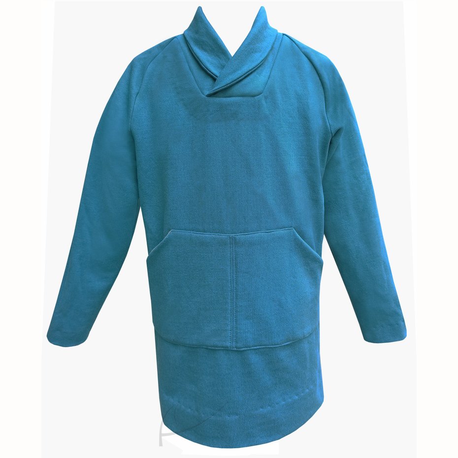 Niebieski sweter z kołnierzem szalowym, kieszenią kangur i reglanowym rękawem.