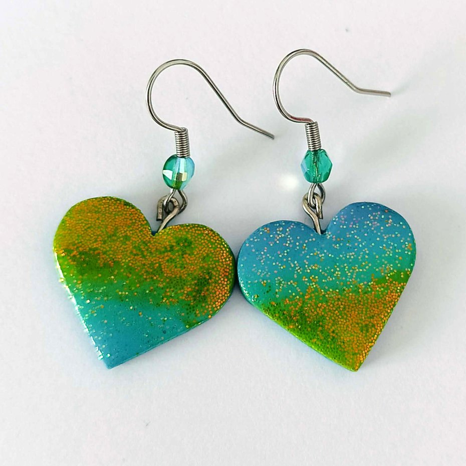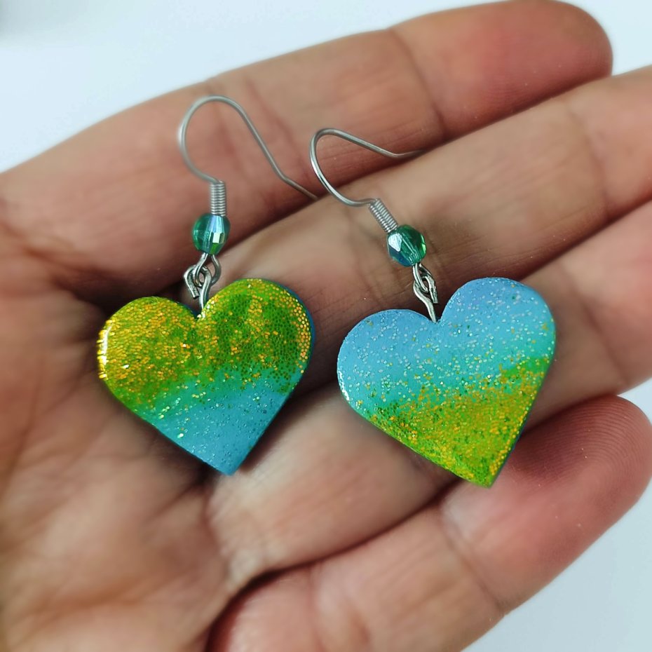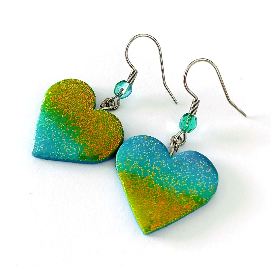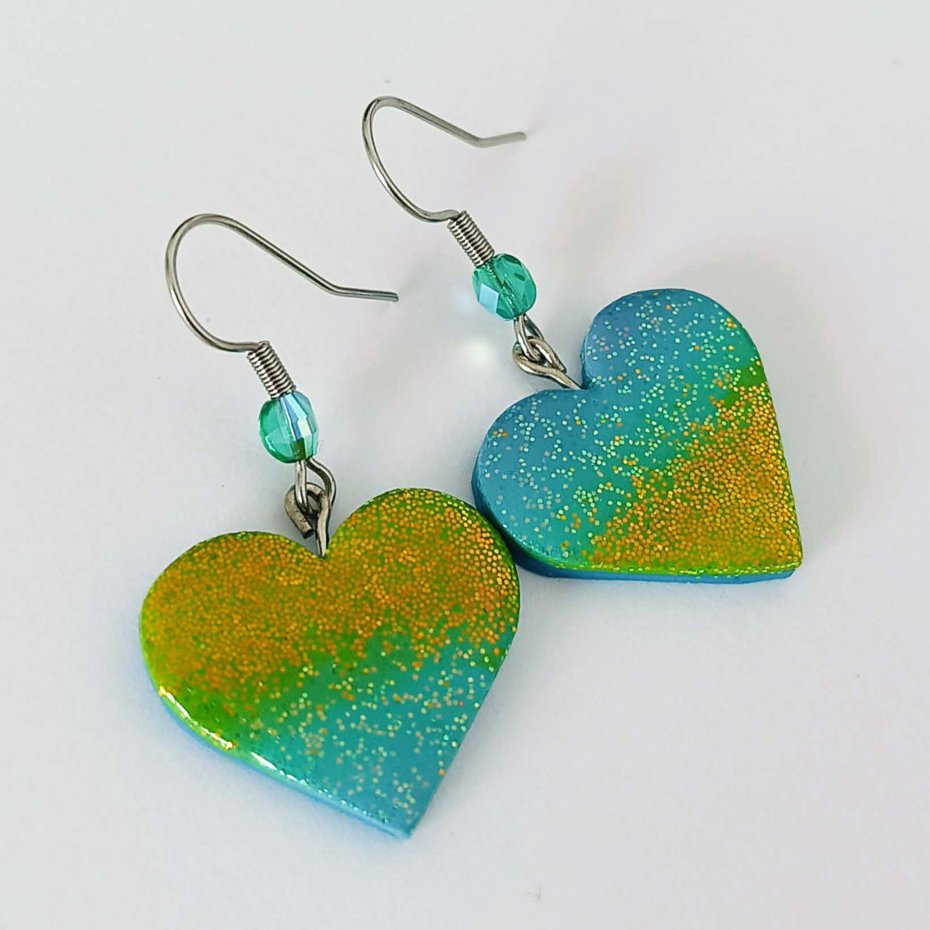 Urocze kolczyki w kształcie serduszek, wykonane ręcznie z modeliny i pokryte połyskującym brokatem. Idealne na prezent dla bliskiej osoby lub jako wyraz miłości do... siebie!
