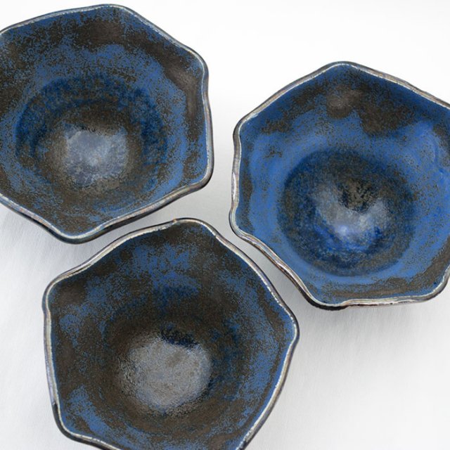 Miski w kolorach granatowym i srebrzysto-złocistym.