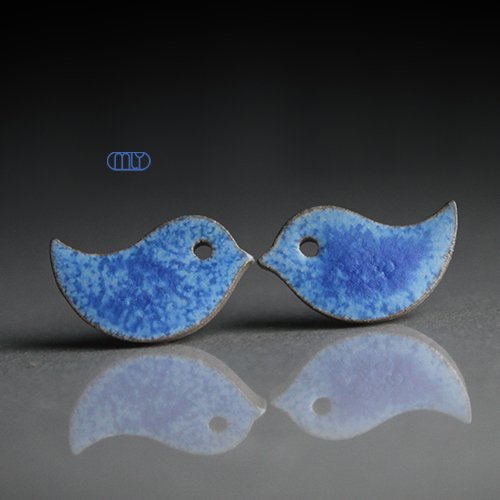 Efektowne kolczyki w formie sztyftów, ręcznie wykonane z delikatnej kamionki, jednostronnie szkliwione błękitnym szkliwem z efektem plamek, na antyalergicznych sztyftach w kolorze srebrnym.długość elementu ceramicznego ok. 17mm, Polecam