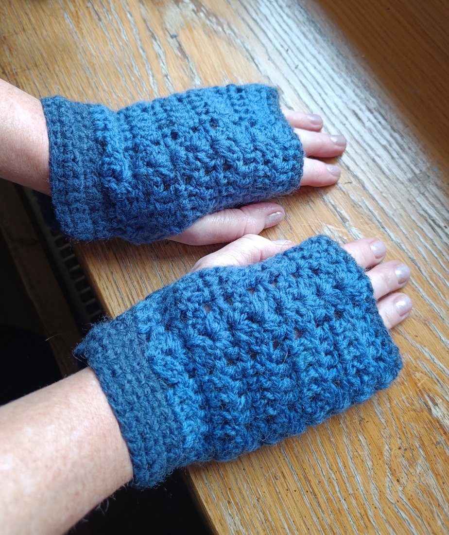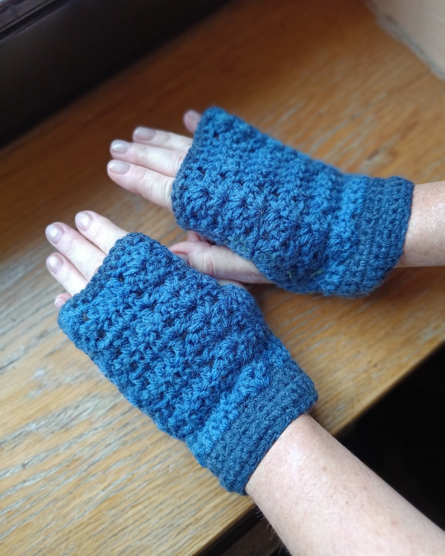 Rękawiczki - mitenki wydziergane na szydełku. Całość zrobiona z włóczki akrylowej z domieszką wełny w dwóch odcieniach - ciemnoniebieskim i granatowym. Prać ręcznie w 40 st.