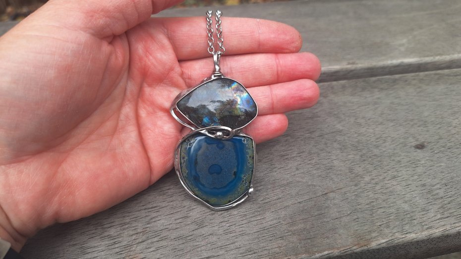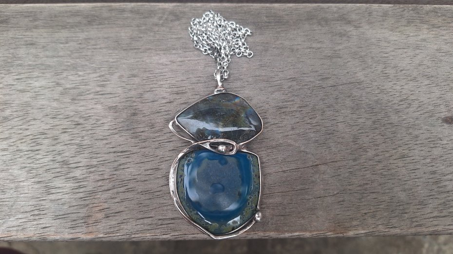 Wisiorek wykonany z miedzi, cyny, labradorytu i agatu. Wymiary ok. 6.5 na 4 cm. Zawieszony na łańcuszku o długości ok. 50 cm.