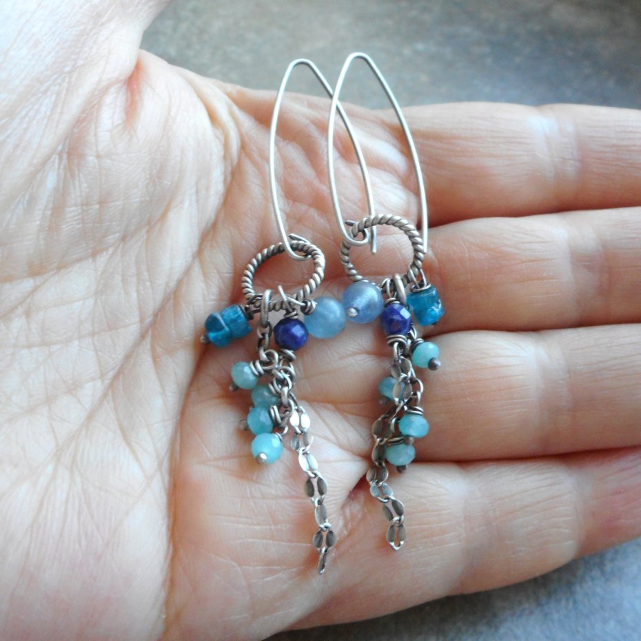 Kolczyki z kamieni naturalnych i szlachetnego srebra; lekkie, zwiewne gałązki ozdobione drobnymi minerałami w niebieskich odcieniach.