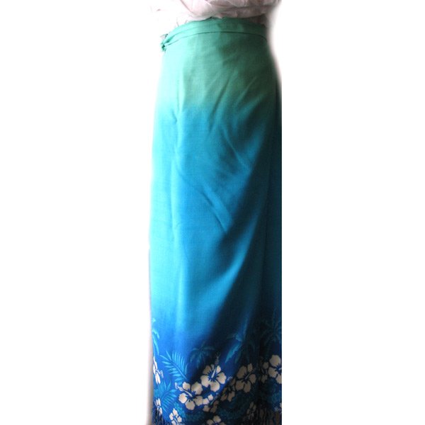 Zakładana spódnica z cieniowanej tkaniny znaleziona w second handzie. Kolor: u góry zieleń przechodząca w intensywny błękit aż do turkusowego granatu na dole spódnicy. Informacja z metki: Materiał: 100% algodon, wyprodukowany w Tajlandii. Spódnica wiązana w pasie, dzięki temu można regulować obwód pasa. Wymiary: całkowity obwód 120 cm. optymalny obwód w pasie to 78 cm, maksymalny obwód w talii to 90 cm, dł. spódnicy 93 cm plus 7 cm frędzli..