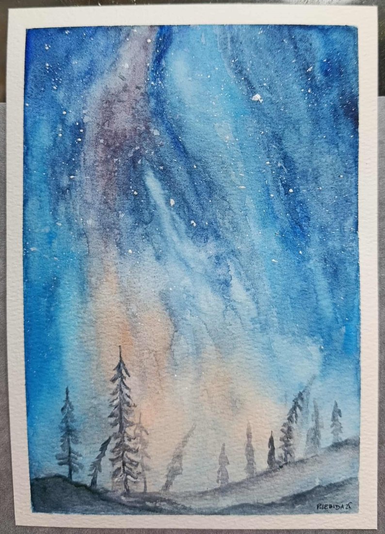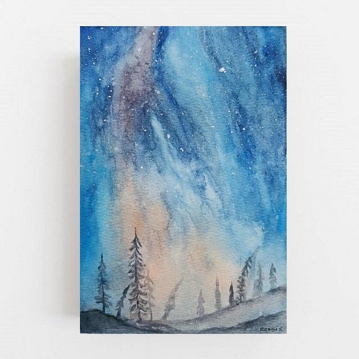 Oryginalna akwarela, wykonana profesjonalnymi farbami akwarelowymi Rembrandt na papierze akwarelowym 300 g/m2 . Praca jest sygnowana. Wymiary pracy : A5 . Kolory mogą się nieznacznie różnić od oryginału, co jest uzależnione od ustawień monitora. Przedstawiona w przykładowej ramie.