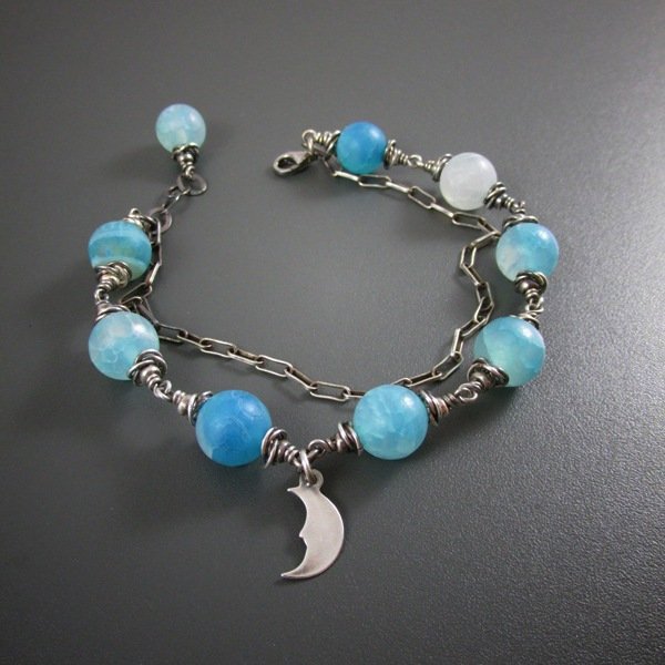 Bransoletka wykonana z kul agatu trawionego 10 mm. Całość dopełniona srebrem 925, oksydowanym i wypolerowanym, w tym blaszka - księżyc. Długość bransoletki wynosi 20 cm plus łańcuszek regulacyjny 2 cm. Pasuje na nadgarstek 16,5-17,5 cm. Elegancko zapakowana.
