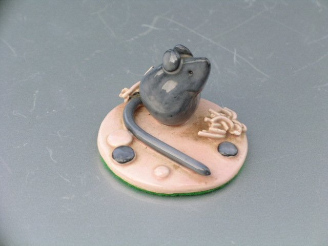 Urocza, ręcznie z porcelanowej masy lepiona i komponowana figurka mysieńka... tycieńka... na filcyku podklejona. Bezbłędna :)