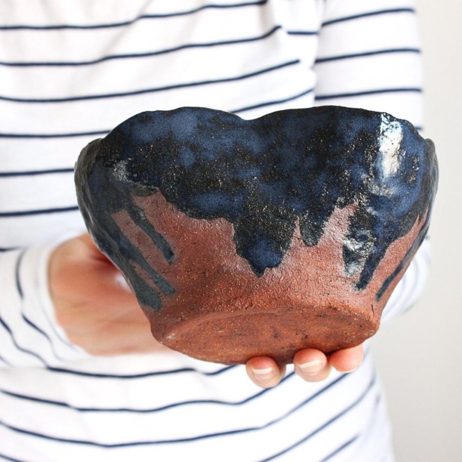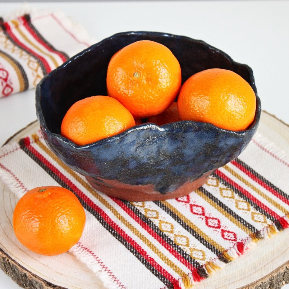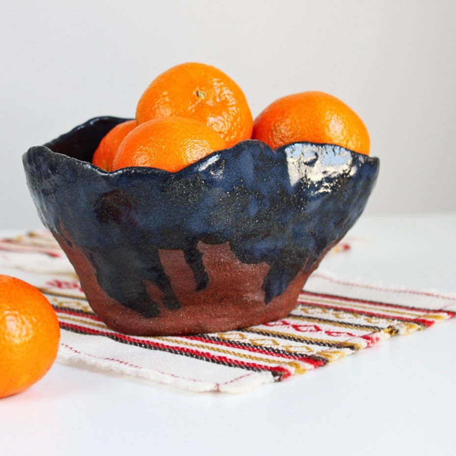 Nieregularna misa np. na owoce wykonana z czerwonej gliny. Ulepiona ręcznie, szkliwiona szkliwem do żywności.