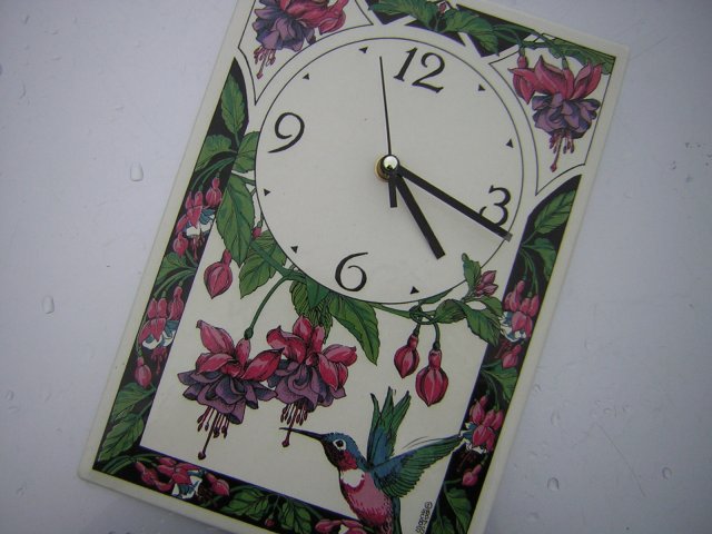 Duży 20,5 x 30 ceramiczny zegar ścienny. Kafel z dziurką i mechanizmem z haczykiem do powieszenia. Mechanizm nowy, na baterię paluszek. Gruby, dość ciężki i przepięknie zdobiony. Kolory żywe, radosne, wykończenie satynowo - błyszczące. Sygnowany na awersie - sygnatura na zdjęciu. Bardzo efektowny i oryginalny. Niespotykany.