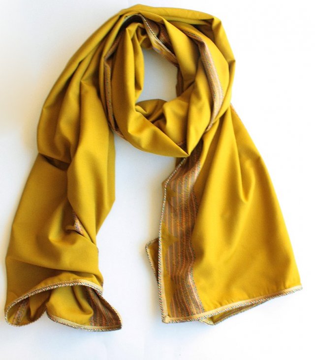 Duży szal w pięknym, niespotykanym kolorze, który możona określić jako ciepły, żółtawy odcień oliwkowy. Szal wykończono atłasową lamówką ozdobioną wielobarwnym warkoczykiem. Materiał to prawdopodobnie wiskoza.
