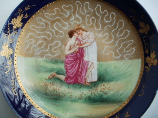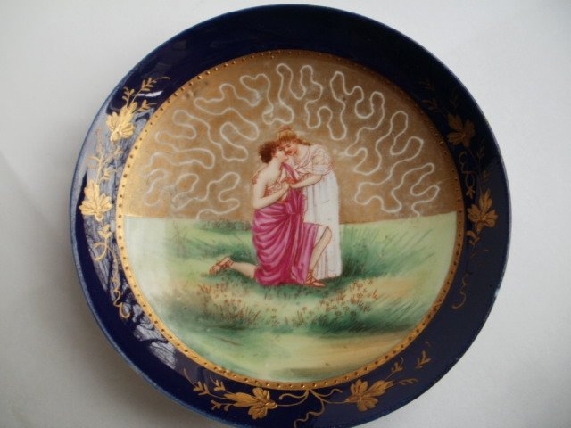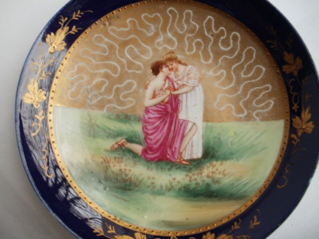 Starej daty to , wielce oryginalna i niespotykana rzecz. Symboliczna ,antyczna, klasyczna, dekoracyjna, użytkowa. Porcelanowy, nieduży talerzyk. Ręcznie zdobiony, częściowo ręcznie malowany. Złote zdobienia na głęboko kobaltowym rancie, wypukłe złote kropeczki, tło, trawy. ..para to oryginalna precyzyjna kalkomania. Użytkowy I bardzo dekoracyjny. Klasyczny. Sygnowany numerycznie "3". Porcelana dźwięczna, dość cienka, szlachetna. Góra około 13 cm dół nie pełne 8 wys. 2 cm Stan zachowania - jak na starą rzecz bardzo dobry. Normalne ślady użytkowania. Bez żadnych większych wad. Piękna rzecz do dekoracji, kolekcji i na oryginalny, symboliczny prezent z duszą; )