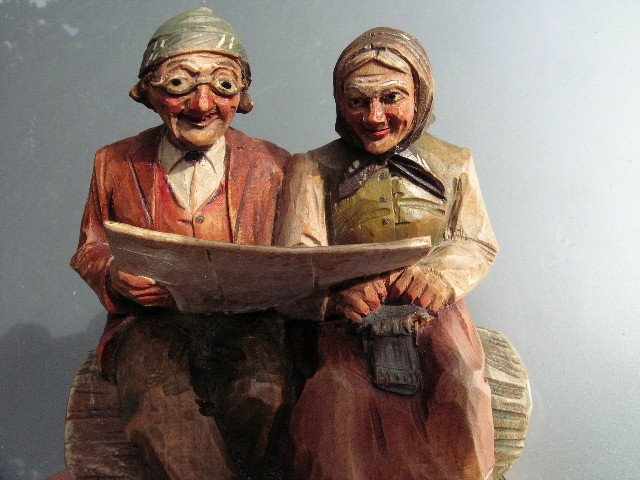 Drewniana Rzeżba wykonana z niewiarygodną wręcz precyzją...okularki,żabki ,dfajka...a nawet mikro druty....a cienkość gazety? Mistrzostwo :) Z jednego kawałka drewna...:)