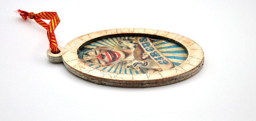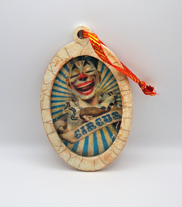 Uroczy, wykonany techniką decoupage obrazek w ramce. Obrazek przedstawia śmiejącego się klauna.